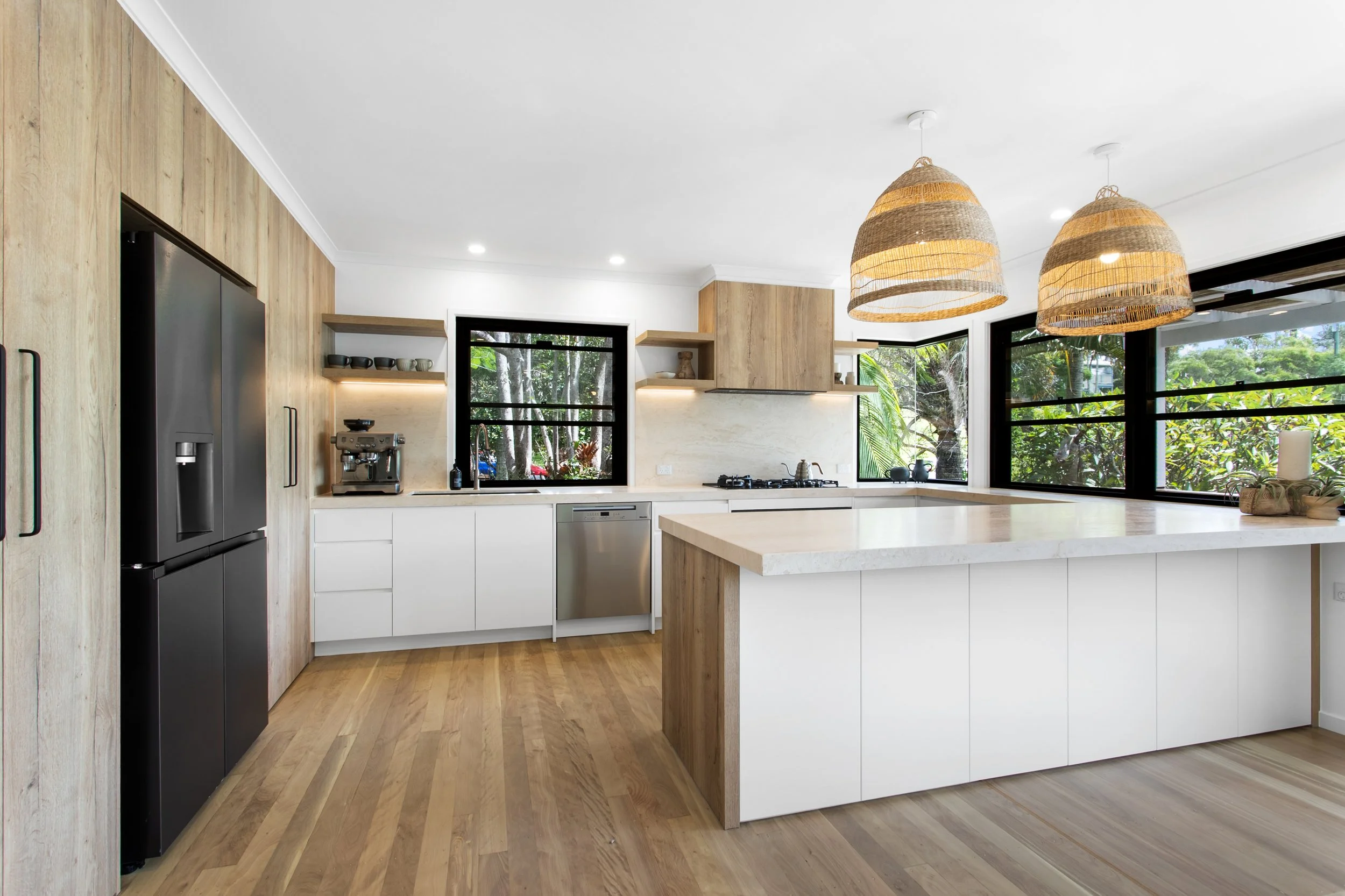 Using natural design elements, the kitchen is enveloped with hand-selected travertine and a combination of engineered-timber and 2PAC cabinetry. The extension required the removal of the external wall and installing new glazing, maximising natural light and views of the outdoors. We also combined old and new timber to create a unified floor using experienced craftsmanship techniques.